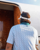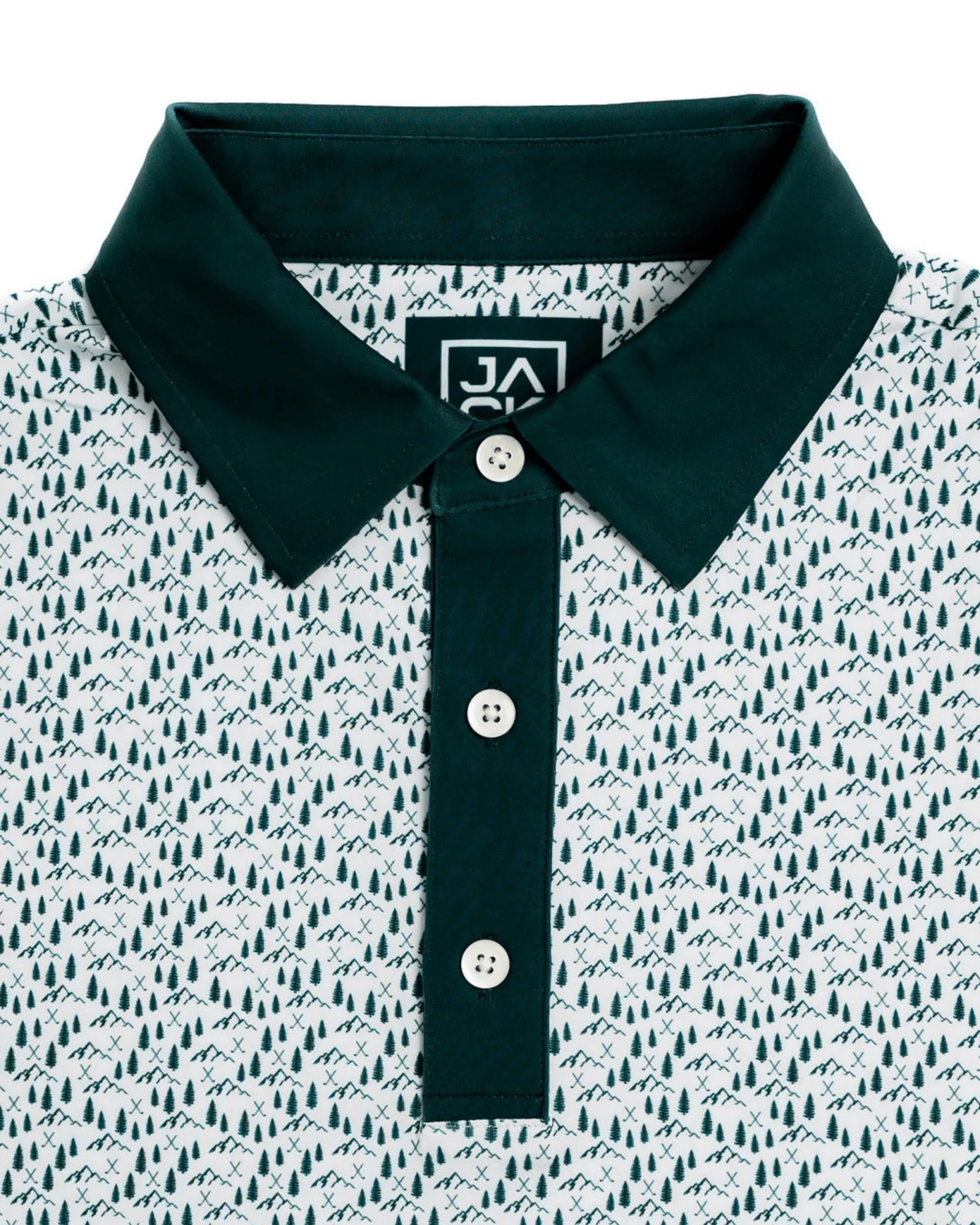 The Mile High polo features a crisp white base that sets a clean and classic backdrop. Across the fabric, subtle yet striking green accents bring the shirt to life. Pine trees, rendered in varying shades of green, are scattered artfully along the torso and sleeves, creating a serene forest feel. Above the trees, stylized mountain silhouettes rise in darker green hues, capturing the majestic peaks of a high-altitude range.