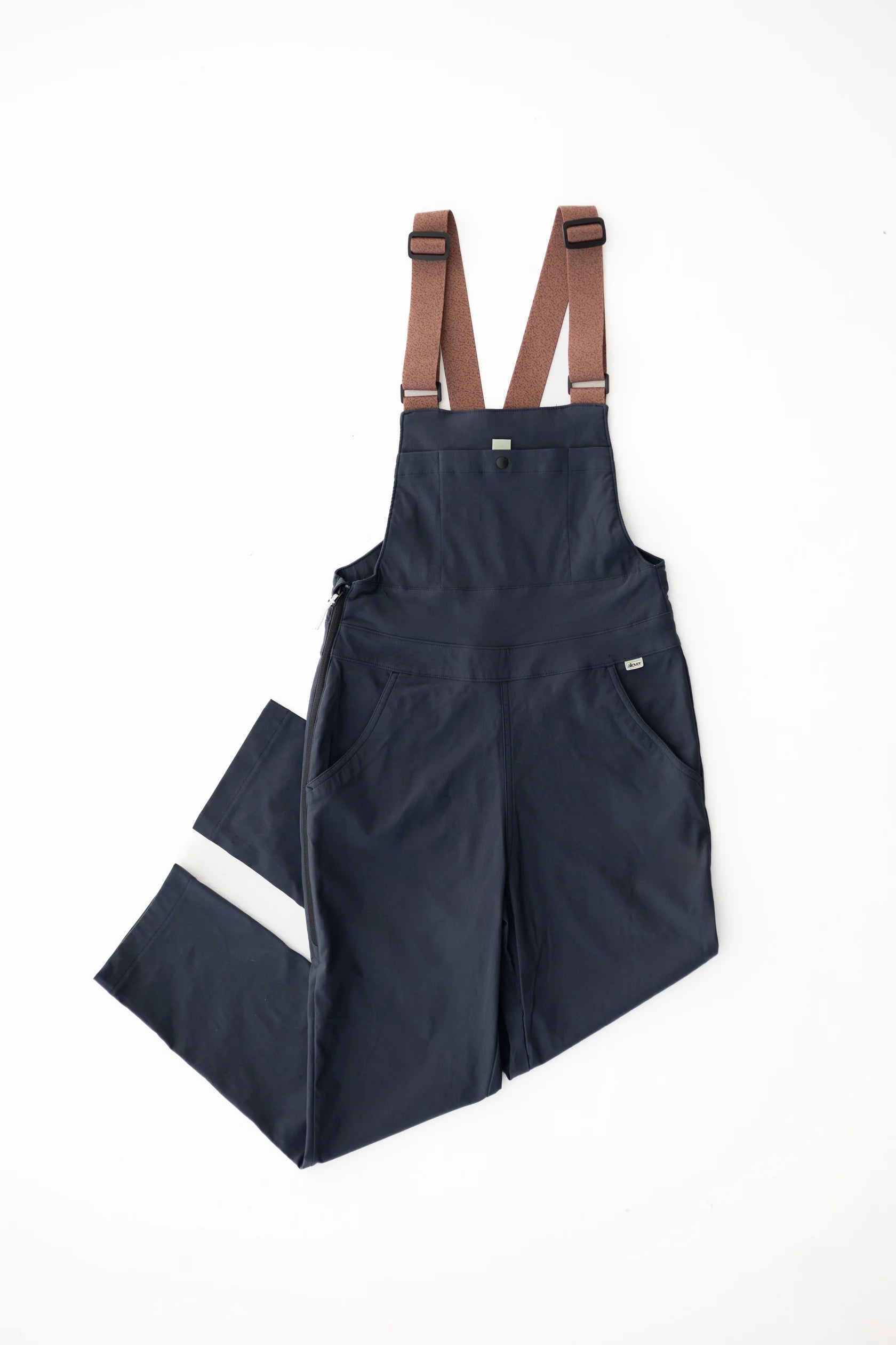 - Side waist zipper. Using the bathroom in overalls has always been tricky; straps go flying in the toilet, and you have to get fully naked. It’s never a relaxed experience, until now. Allover buckles don’t release at all. Instead you zip down the side of the overalls and move the fabric around your bottom. The straps provide enough stretch that it’s very easy to pull the fabric around.